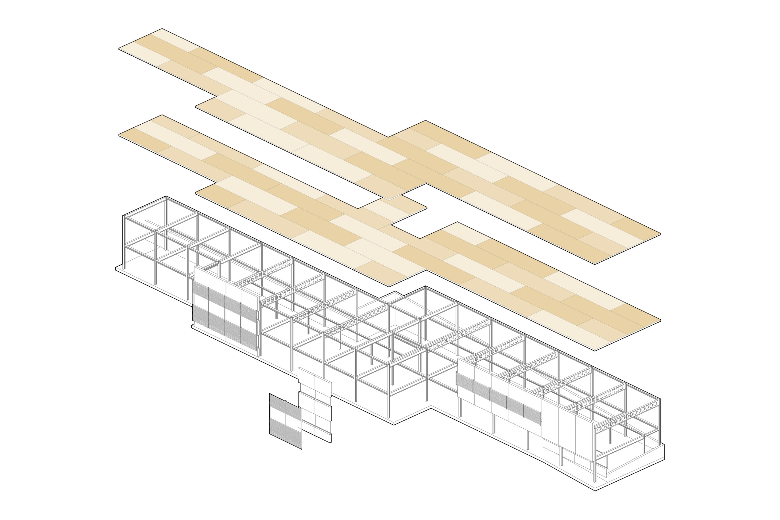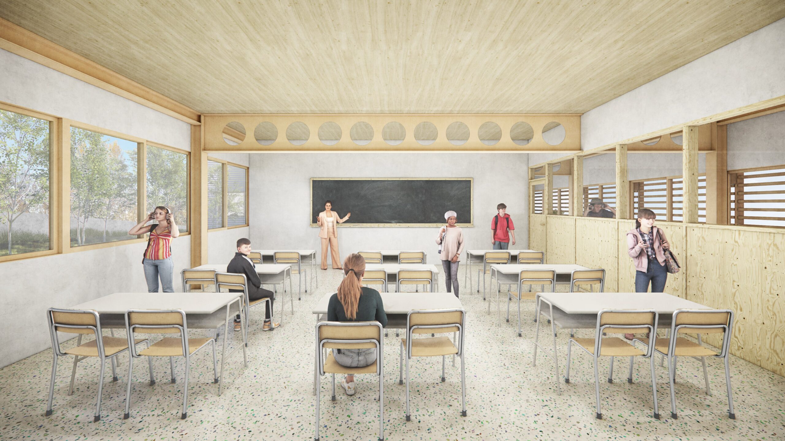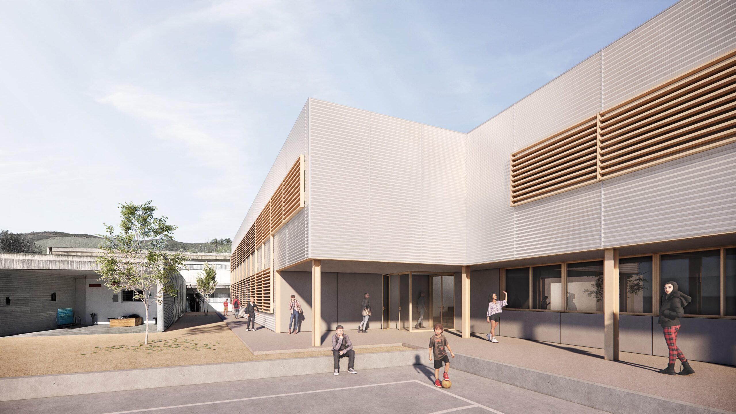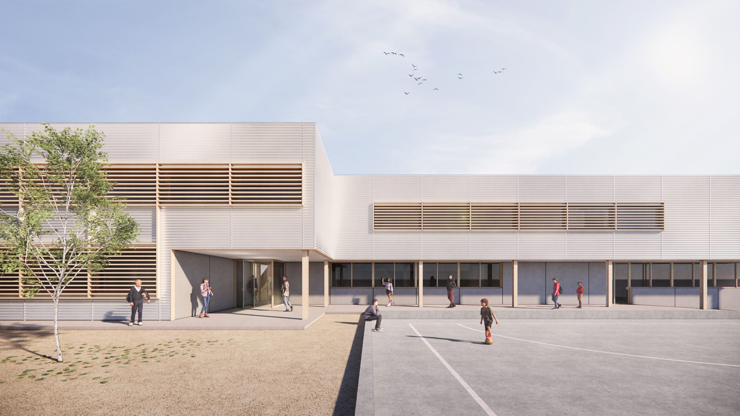 Winning proposal for the competition for the expansion of the El Morsell school into a high school. The proposal is solved with a lightweight structure of metal pillars and beams and CLT cross-laminated timber floors. The facade, manufactured in a workshop with a lightweight timber frame structure, will be assembled in modules on site.