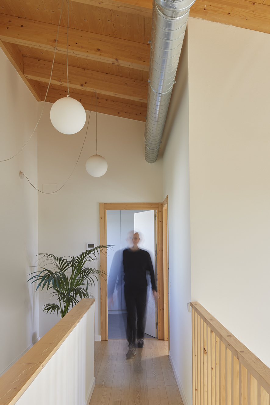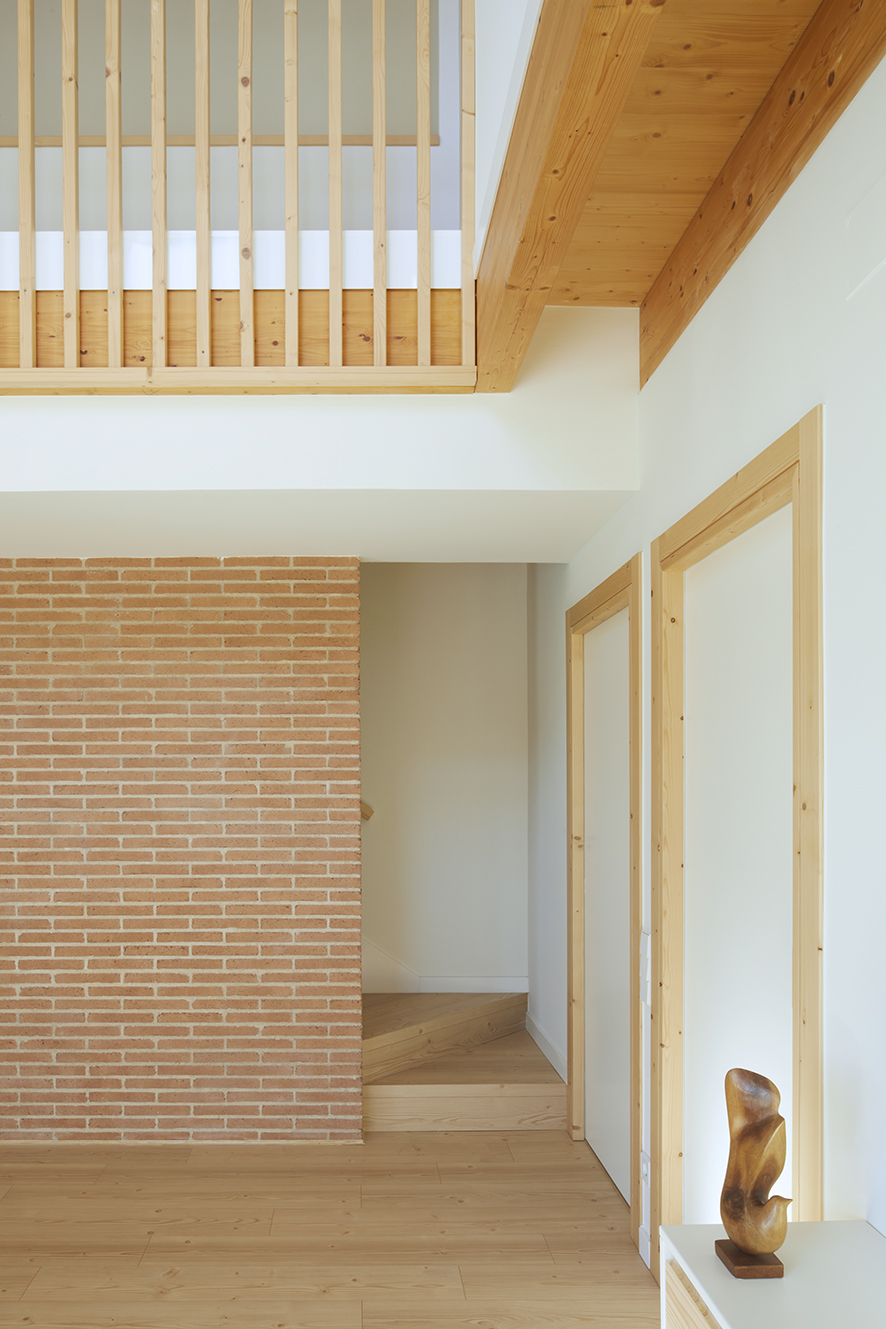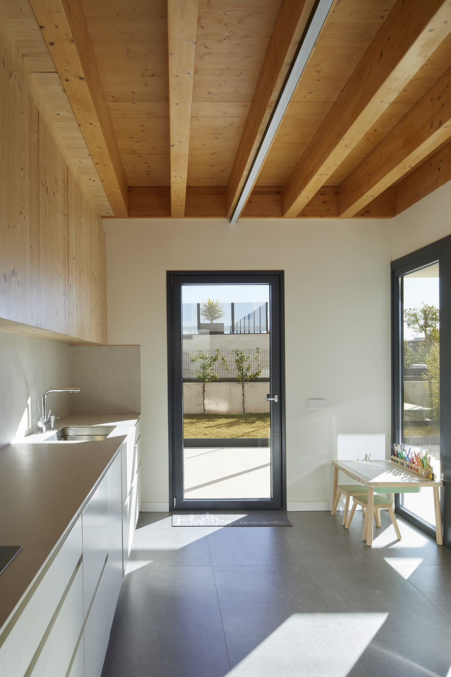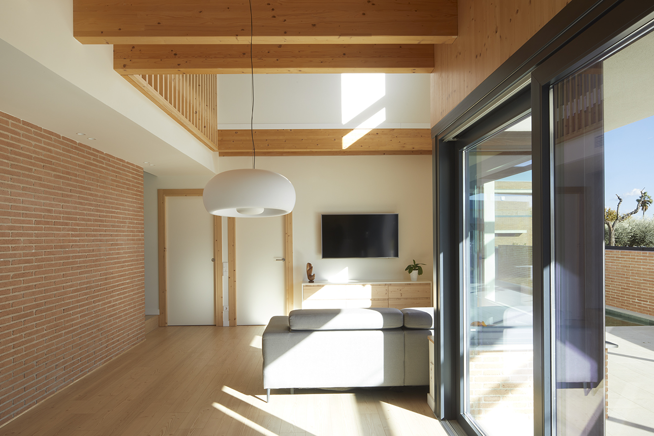 La casa está construida siguiendo criterios activos y pasivos de sostenibilidad, con la utilización de materiales naturales como la cerámica y la madera, la ejecución de una envolvente aislada sin puentes térmicos, o la cubierta ventilada.