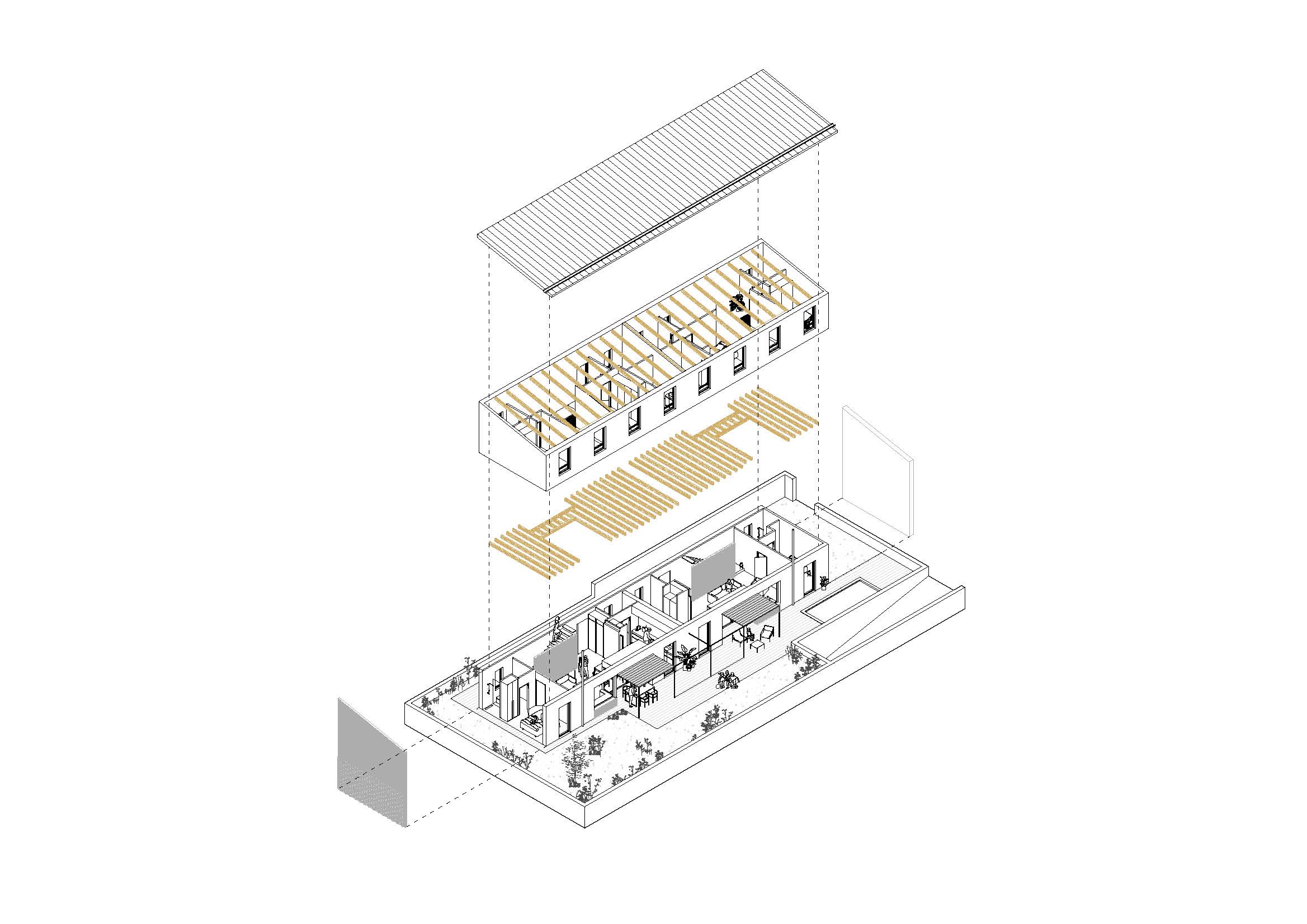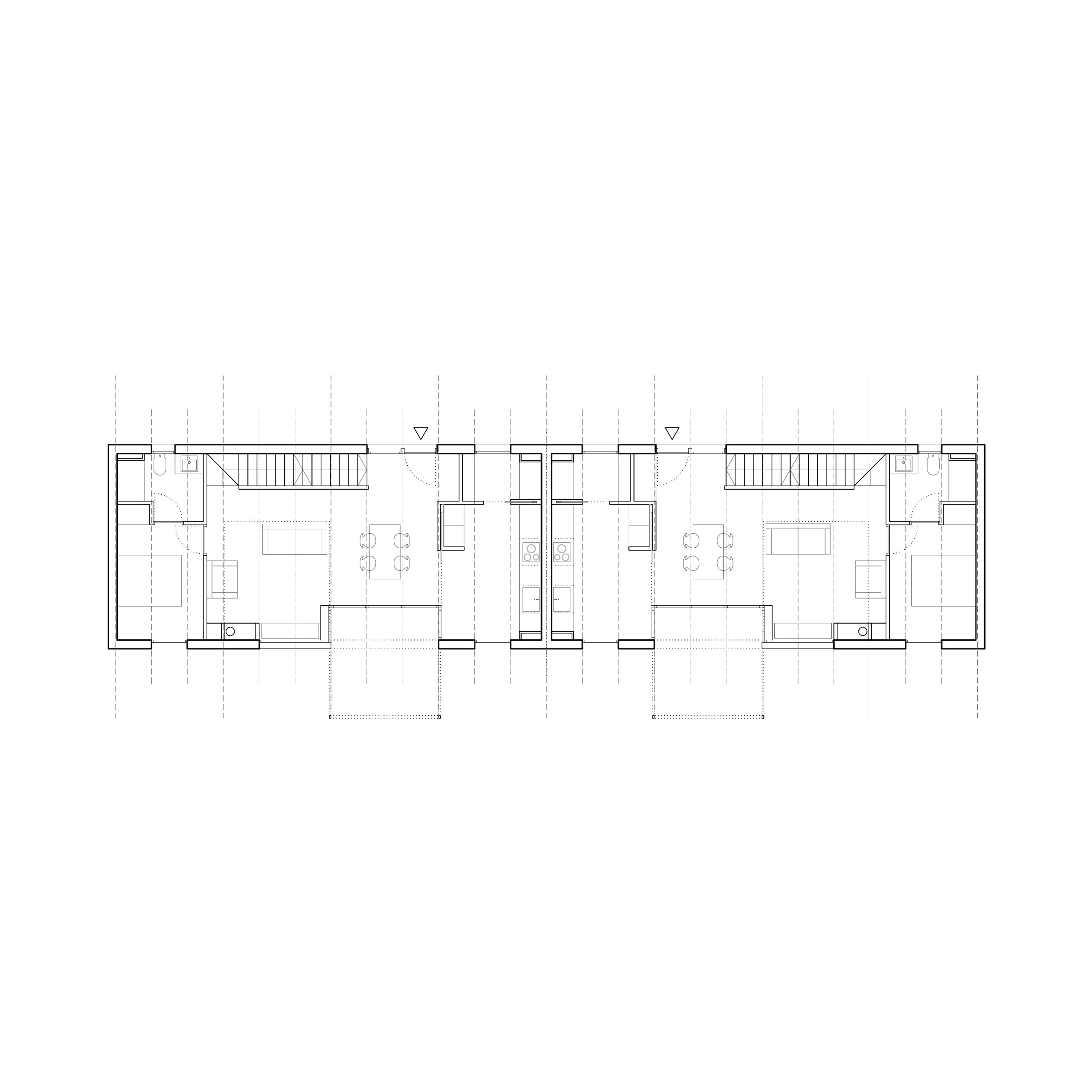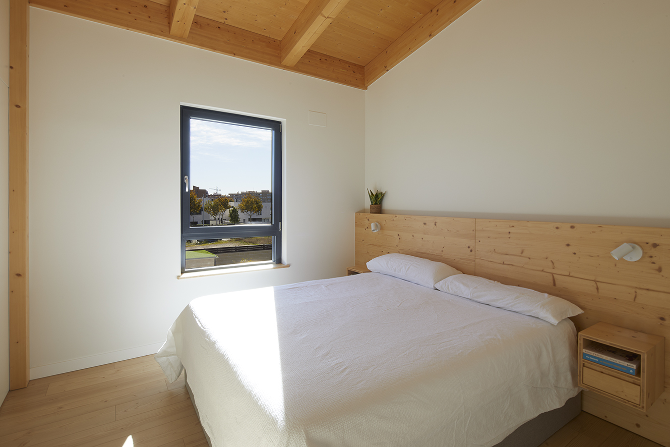 Las casas están moduladas, generando 4 espacios contiguos de 3 módulos que determinan las dimensiones de las estancias y de las aberturas, y que se corresponden con las vigas de los forjados entre planta y cubierta.