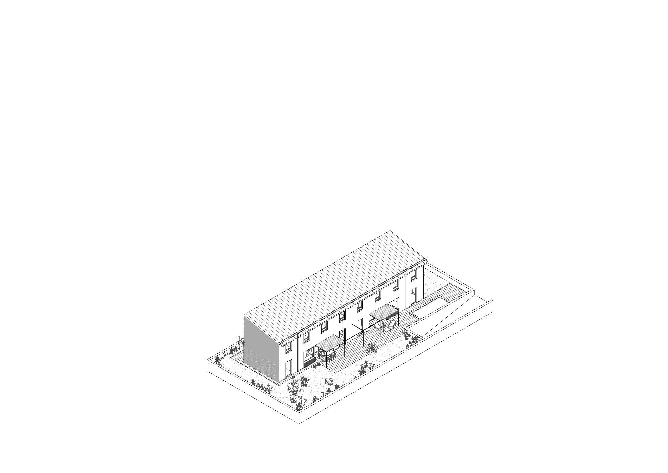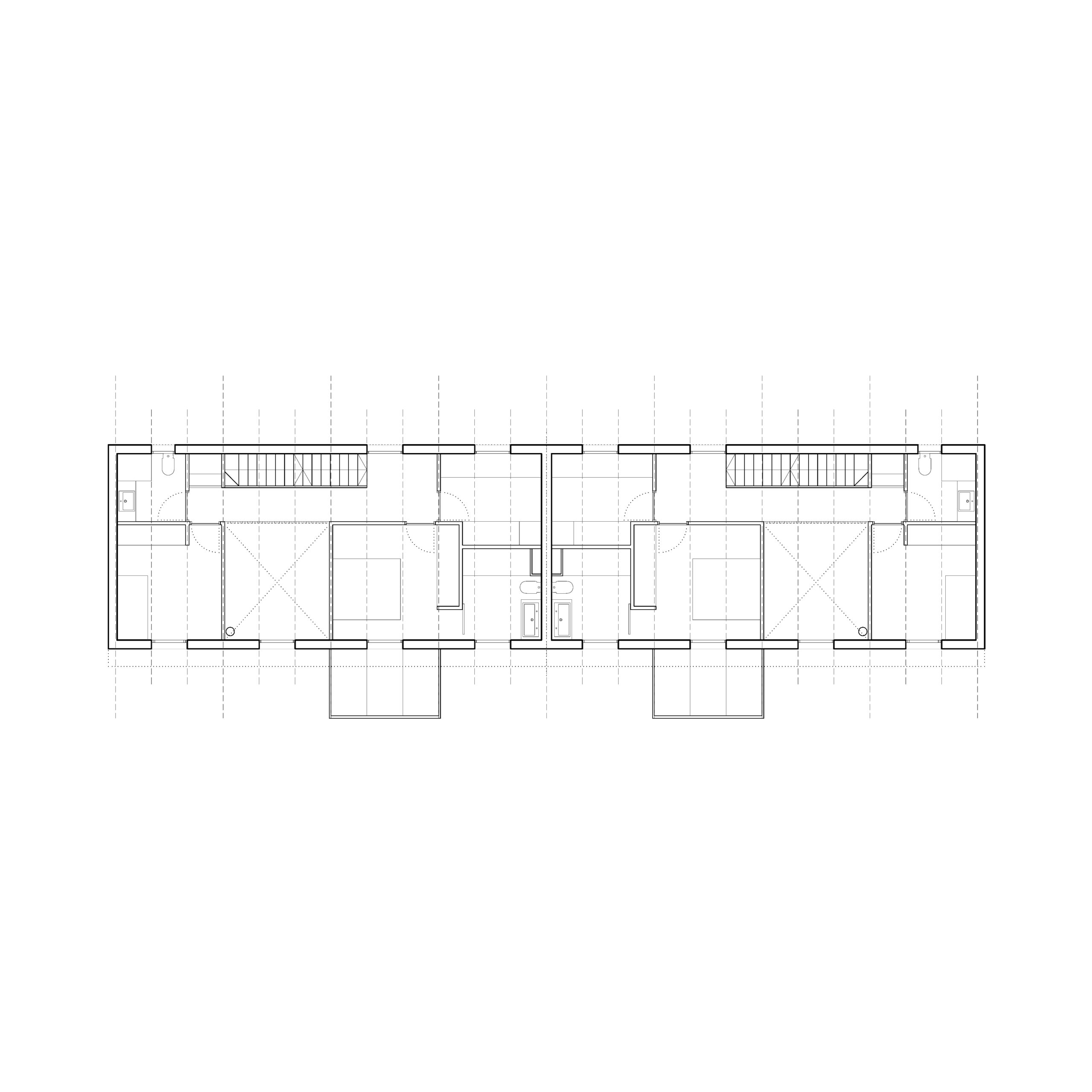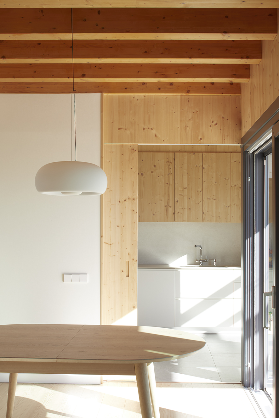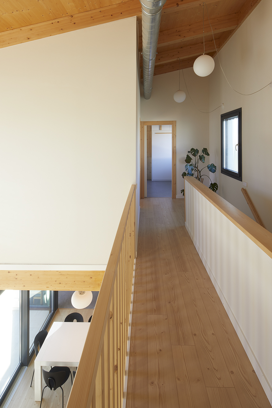 Las casas están moduladas, generando 4 espacios contiguos de 3 módulos que determinan las dimensiones de las estancias y de las aberturas, y que se corresponden con las vigas de los forjados entre planta y cubierta.