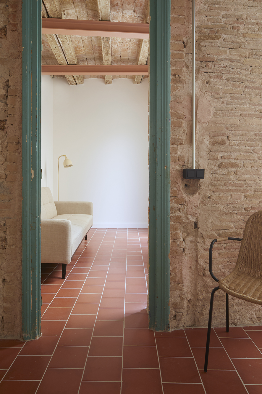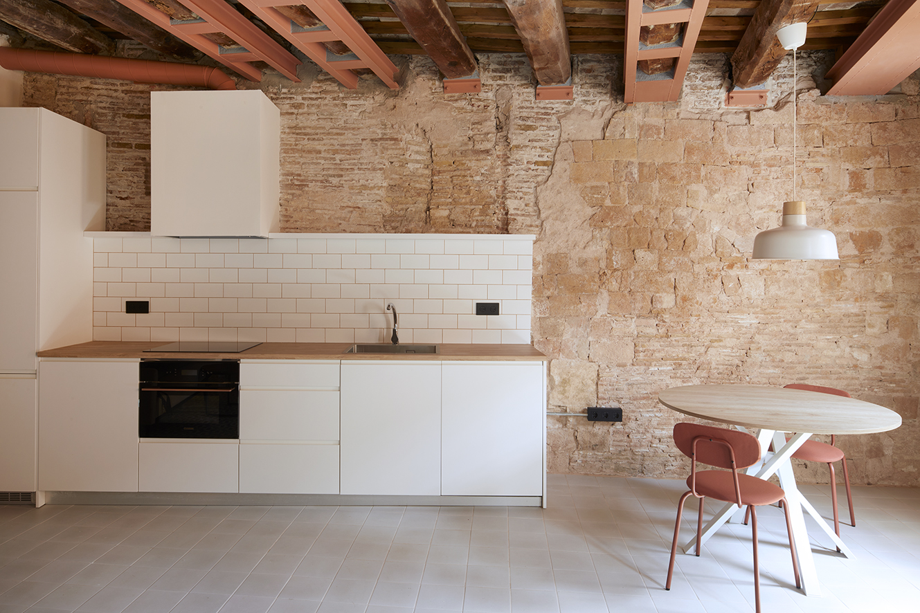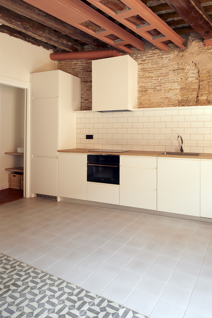 Reforma de 2 habitatges de 2 edificis contigus, on hem fet un exercici d’extracció de capes per tal de deixar a la vista la materialitat original de l’edifici. La volta de rajola i les bigues de fusta als forjats, la pedra i el maó del murs de façana, la geometria que genera la mitgera de maó, i la reutilització dels paviments hidràulics originals dona caràcter i calidesa al projecte.