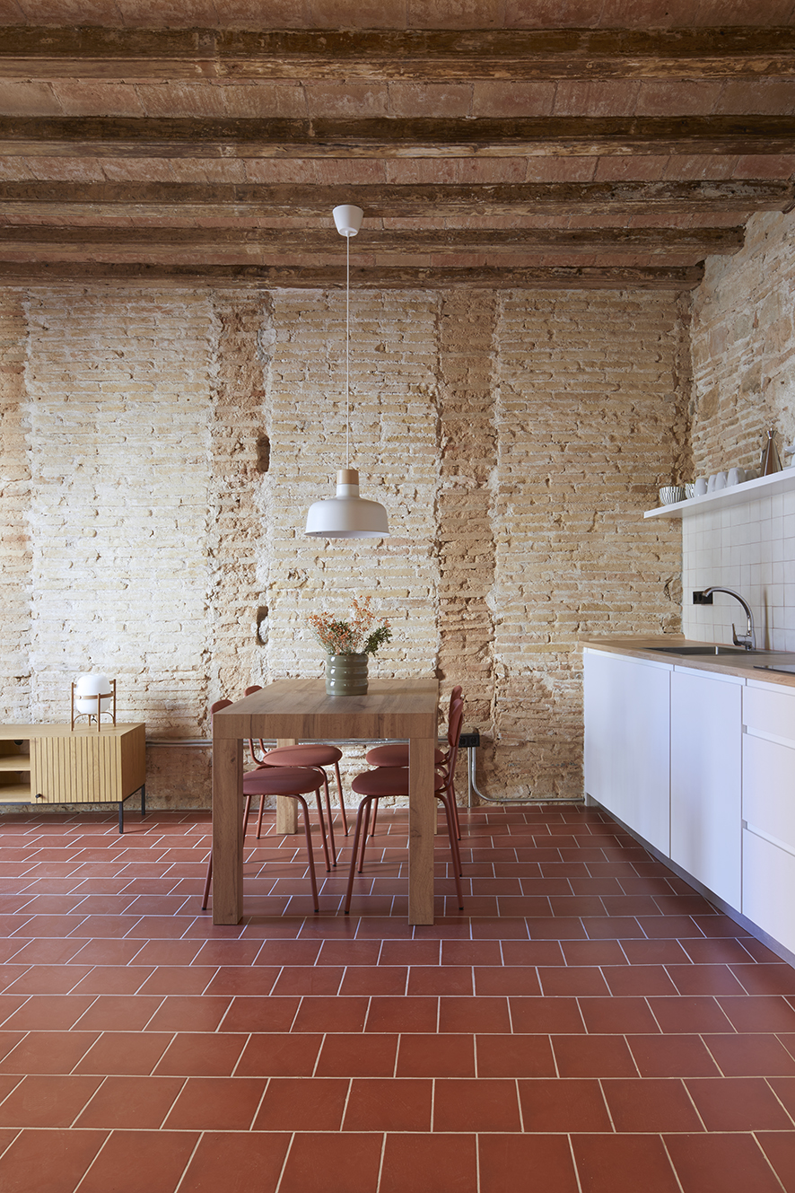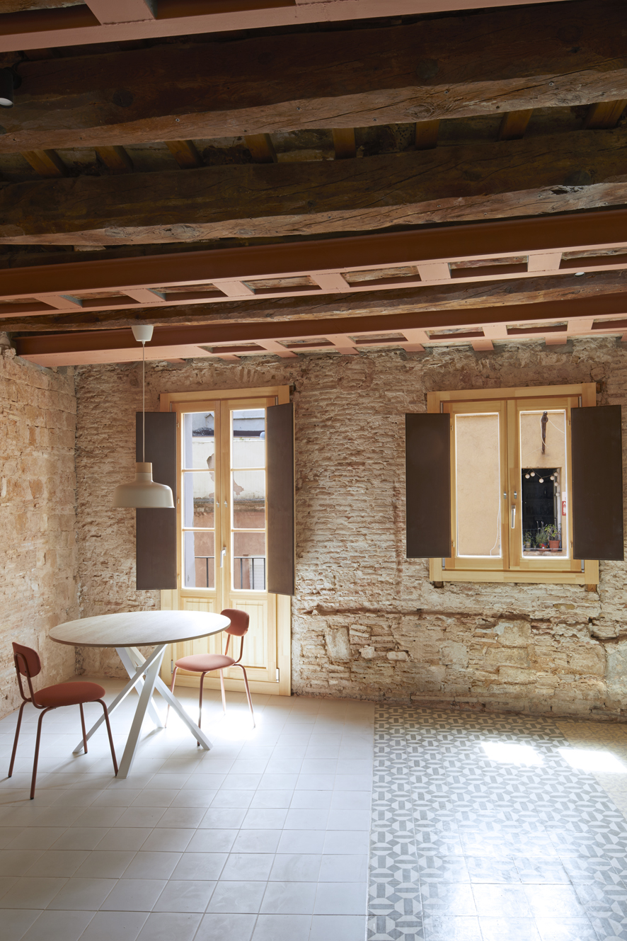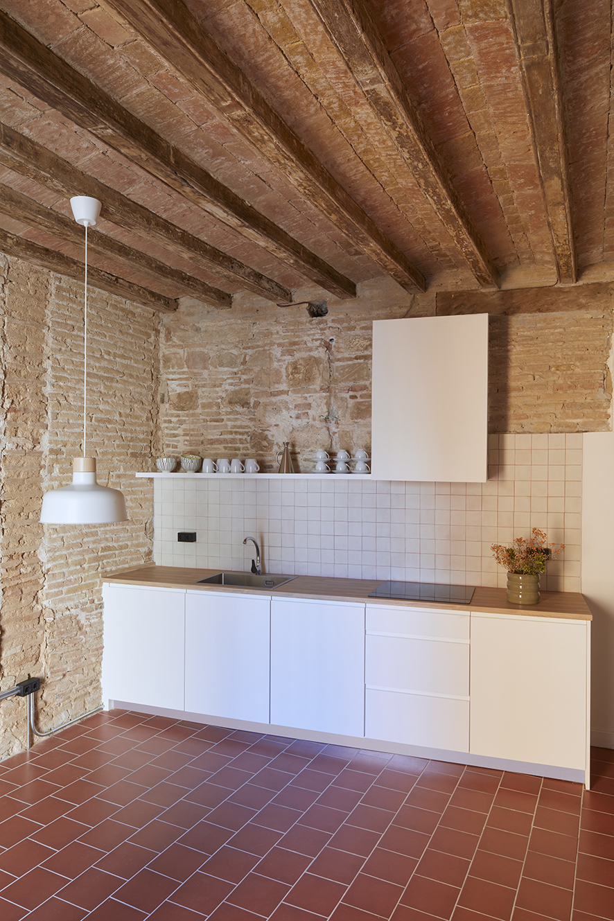 Reforma de 2 habitatges de 2 edificis contigus, on hem fet un exercici d’extracció de capes per tal de deixar a la vista la materialitat original de l’edifici. La volta de rajola i les bigues de fusta als forjats, la pedra i el maó del murs de façana, la geometria que genera la mitgera de maó, i la reutilització dels paviments hidràulics originals dona caràcter i calidesa al projecte.